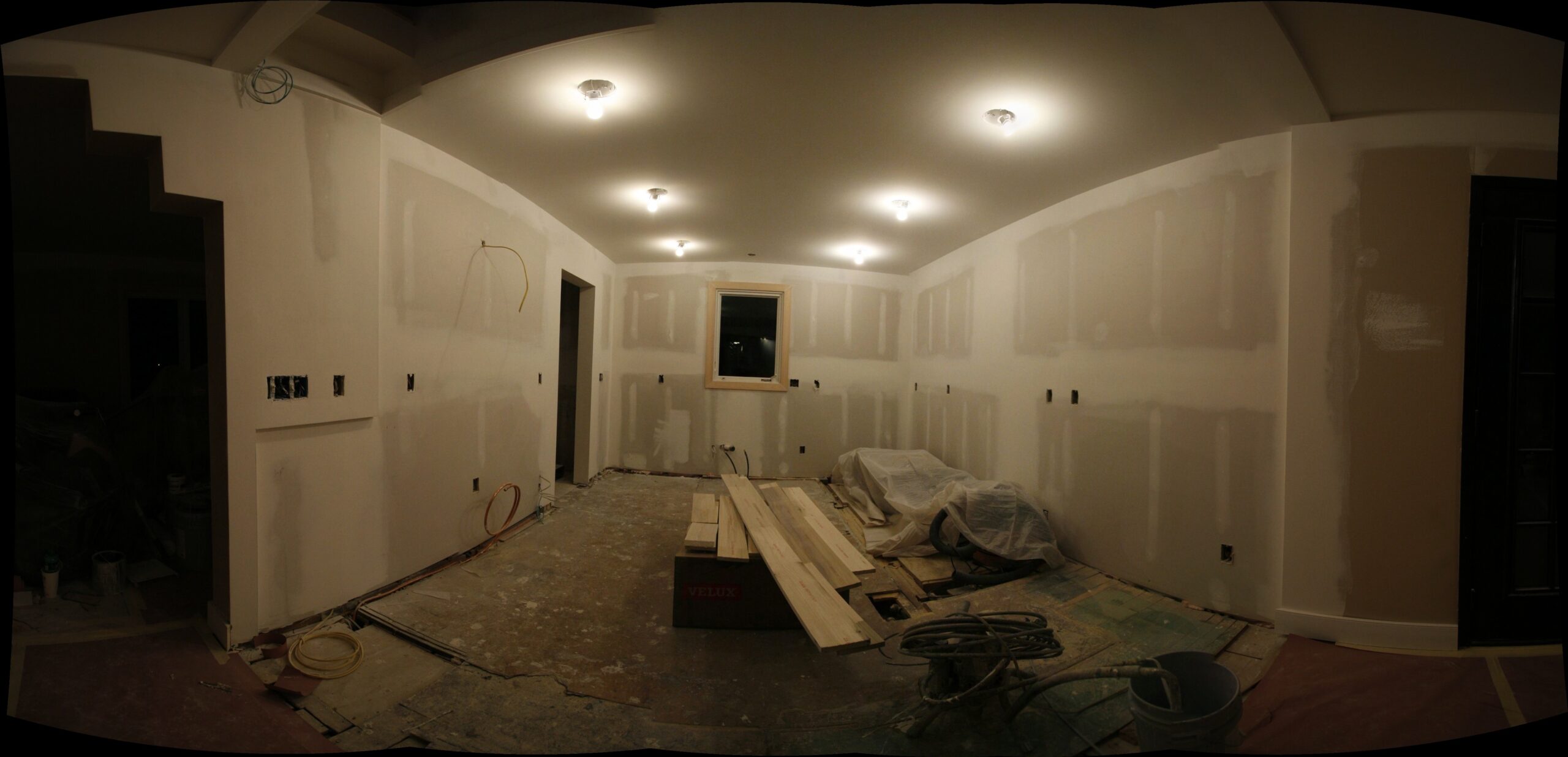 This is the state of the art in making walls for the homes we live in.  The process is messy, yes, but the result is that the walls are smooth and flat with knife-edge perfect corners.  Life is filled with tradeoffs, and spattered, splattered, and dusty as it is, This Odd House now displays a truer line to its visitors and occupants.
